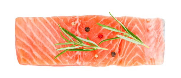 Salmon Steak Topped with Rosemary and Pepper Isolated on White Background